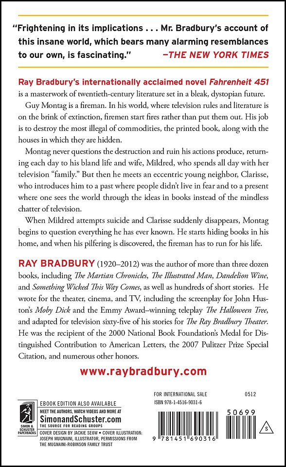 Guy Montag is a fireman. In his world, where television rules and literature is on the brink of extinction, firemen start fires rather than put them out. His job is to destroy the most illegal of commodities, the printed book, along with the houses in which they are hidden. Montag never questions the destruction and ruin his actions produce, returning each day to his bland life and wife, Mildred, who spends all day with her television "family." But then he meets an eccentric young neighbor, Clarisse, who introduces him to a past where people didn't live in fear and to a present where one sees the world through the ideas in books instead of the mindless chatter of television. When Mildred attempts suicide and Clarisse suddenly disappears, Montag begins to question everything he has ever known. He starts hiding books in his home, and when his pilfering is discovered, the fireman has to run for his life.