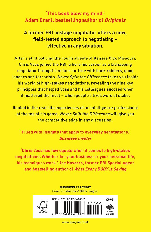 Never Split the Difference takes you inside his world of high-stakes negotiations, revealing the nine key principles that helped Voss and his colleagues succeed when it mattered the most - when people's lives were at stake. Rooted in the real-life experiences of an intelligence professional at the top of his game, Never Split the Difference will give you the competitive edge in any discussion. "Filled with insights that apply to everyday negotiations." (Business Insider).
