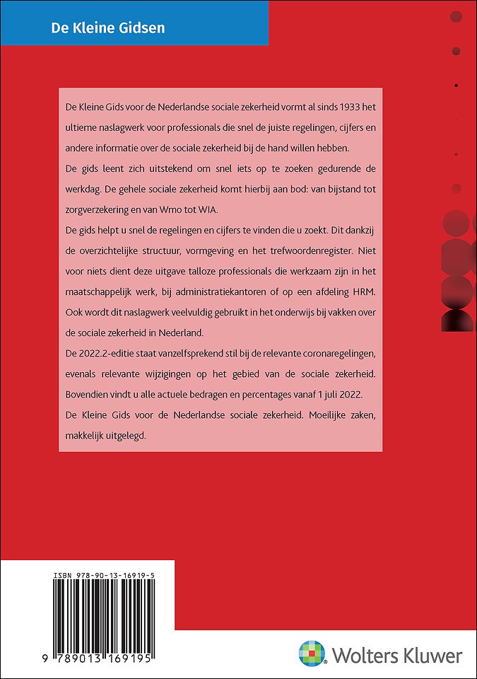 Deze kleine gids vormt al sinds 1933 het ultieme naslagwerk voor professionals die snel de juiste regelingen, cijfers en andere informatie over de sociale zekerheid bij de hand willen hebben. De gids leent zich uitstekend om snel iets op te zoeken gedurende de werkdag, vooral dankzij de overzichtelijke structuur, vormgeving en het trefwoordenregister. Niet voor niets wordt deze titel door talloze professionals gebruikt die werkzaam zijn in het maatschappelijk werk, bij administratiekantoren of op een afdeling HRM. Ook wordt dit naslagwerk veelvuldig gebruikt in het onderwijs bij vakken over de sociale zekerheid in Nederland.