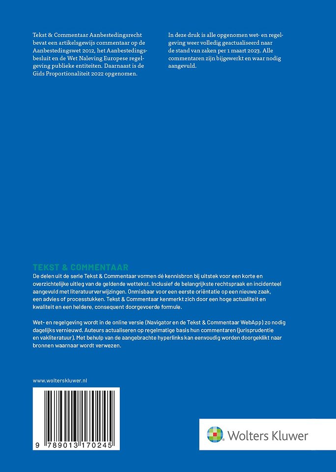 Tekst & Commentaar Aanbestedingsrecht vormt dé kennisbron bij uitstek voor een korte en overzichtelijke uitleg van de geldende wettekst. Inclusief de belangrijkste rechtspraak en waar nodig aangevuld met literatuurverwijzingen. Onmisbaar voor een eerste oriëntatie op een nieuwe zaak, een advies of processtukken. Gebruikers waarderen de serie vanwege de betrouwbaarheid en actualiteit.