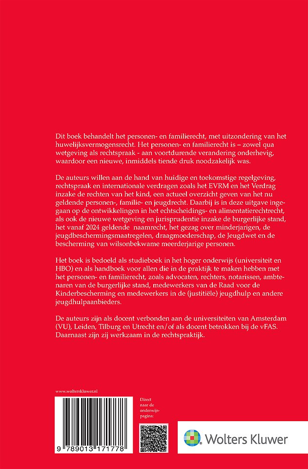 Het personen- en familierecht is voortdurend aan veranderingen onderhevig, zowel qua wetgeving als rechtspraak. Deze tiende druk is in tal van opzichten bijgewerkt om recht te doen aan deze ontwikkelingen. Zo vindt u vanzelfsprekend de laatste rechtspraak op het terrein van het familie- en jeugdrecht, inclusief het procesrecht. Ook leest u over recente ontwikkelingen in onder meer het scheidings(proces)recht, het afstammings- en gezagsrecht, het (nieuwe) naamrecht en de (uitwerking van de) voorstellen van de Staatscommissie Herijking ouderschap.