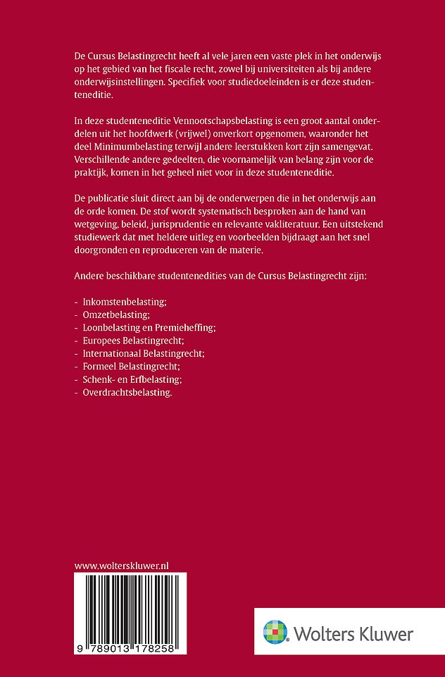 Deze studenteneditie van de Cursus Belastingrecht Vennootschapsbelasting behandelt de laatste stand van zaken in de wetgeving, beleid, jurisprudentie en vakliteratuur, ondersteund met heldere uitleg en voorbeelden. De titel wordt gezien als de meest brede en diepgaande publicatie over de vennootschapsbelasting. De inhoud is tot stand gekomen in nauwe samenwerking met universitaire vakgroepen.