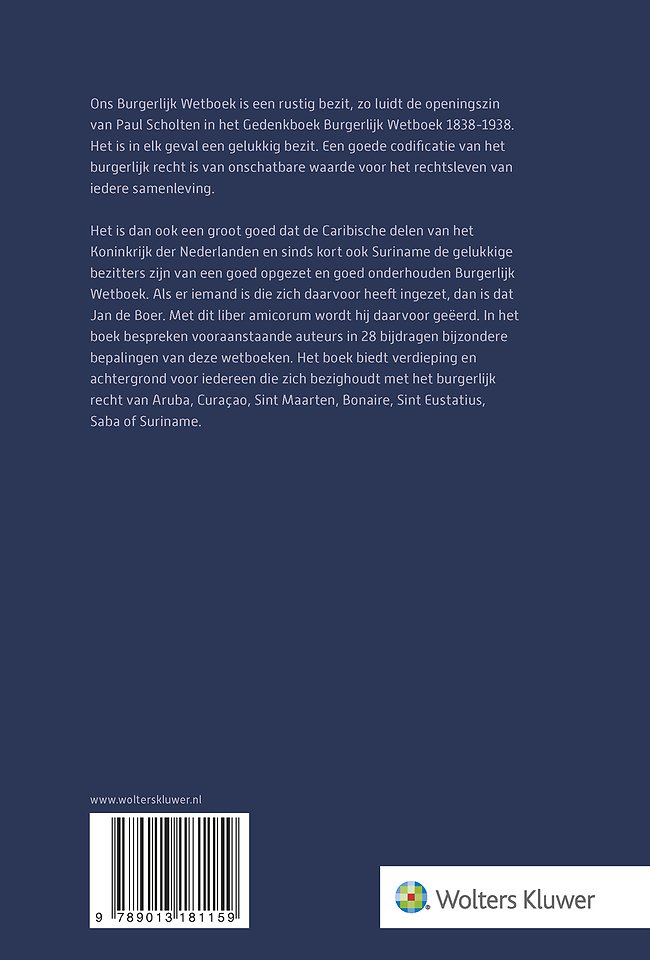 Deze informatie is van belang voor iedereen die geïnteresseerd is in deze rechtsgebieden en helpt om valkuilen te vermijden die kunnen ontstaan door de verschillen met het Burgerlijk Wetboek van Europees Nederland. De publicatie sluit aan bij de recente invoering van het Burgerlijk Wetboek in Suriname, wat een belangrijke ontwikkeling is in het vakgebied. Het is de bekroning van de inspanningen van Jan de Boer gedurende drie decennia om het Burgerlijk Wetboek in het Caribische deel van het Koninkrijk en Suriname in te voeren.