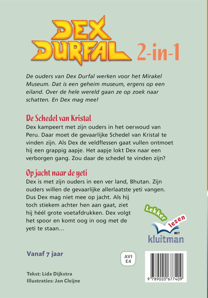 In 'Op jacht naar de yeti' (deel 2 van de serie Dex Durfal) gaan de ouders van Dex op zoek naar een verschrikkelijke sneeuwman. Dex mag niet mee op jacht, want dat is te gevaarlijk. Stiekem doet hij het toch en hij volgt een spoor van grote voetafdrukken. Dan loopt hij de yeti tegen het lijf…