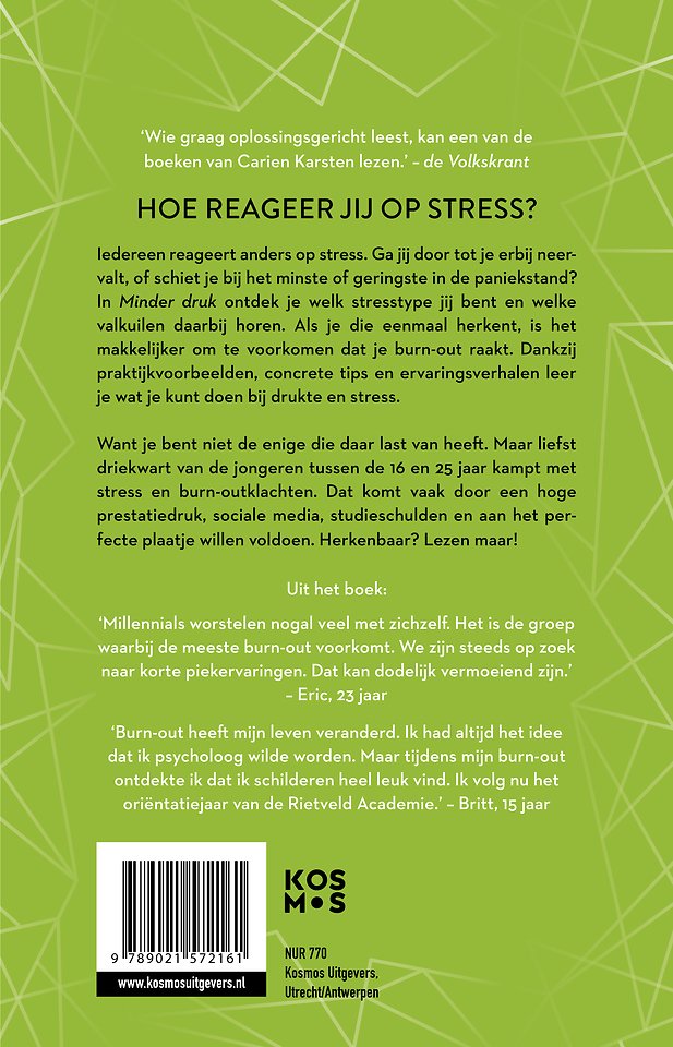 De cijfers over stress bij jongeren liegen er niet om. Driekwart van de Nederlandse scholieren ervaart prestatiedruk en kampt als gevolg daarvan met stress- en burn-outklachten. In Minder druk helpt psychotherapeut Carien Karsten jongeren ontdekken welk stresstype ze zijn en de valkuilen op tijd te herkennen, zodat zij hierop kunnen inspelen.