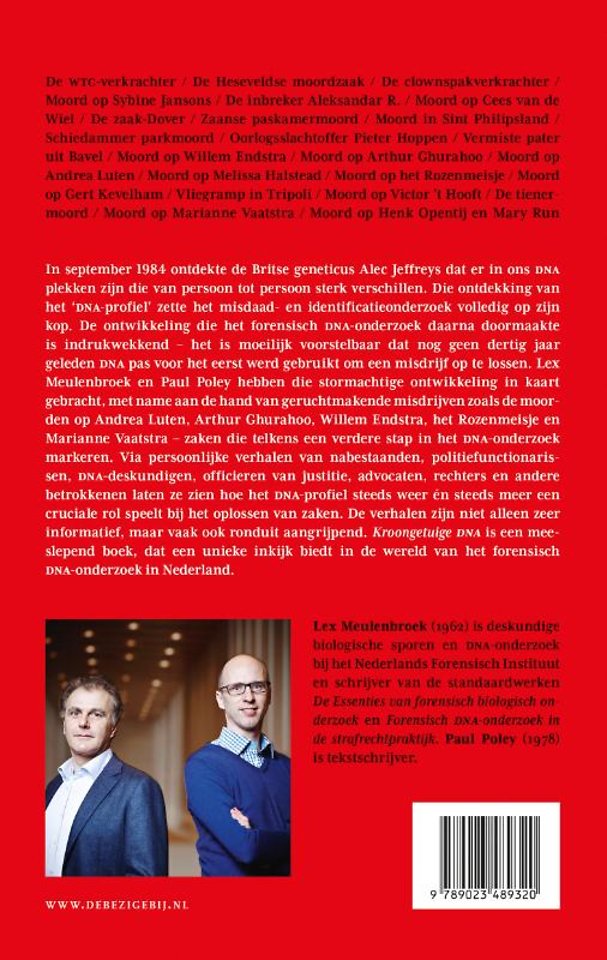 Lex Meulenbroek en Paul Poley hebben die stormachtige ontwikkeling in kaart gebracht, met name aan de hand van geruchtmakende misdrijven zoals de moorden op Andrea Luten, Arthur Ghurahoo, Willem Endstra, het Rozenmeisje en Marianne Vaatstra zaken die telkens een verdere stap in het dna-onderzoek markeren.