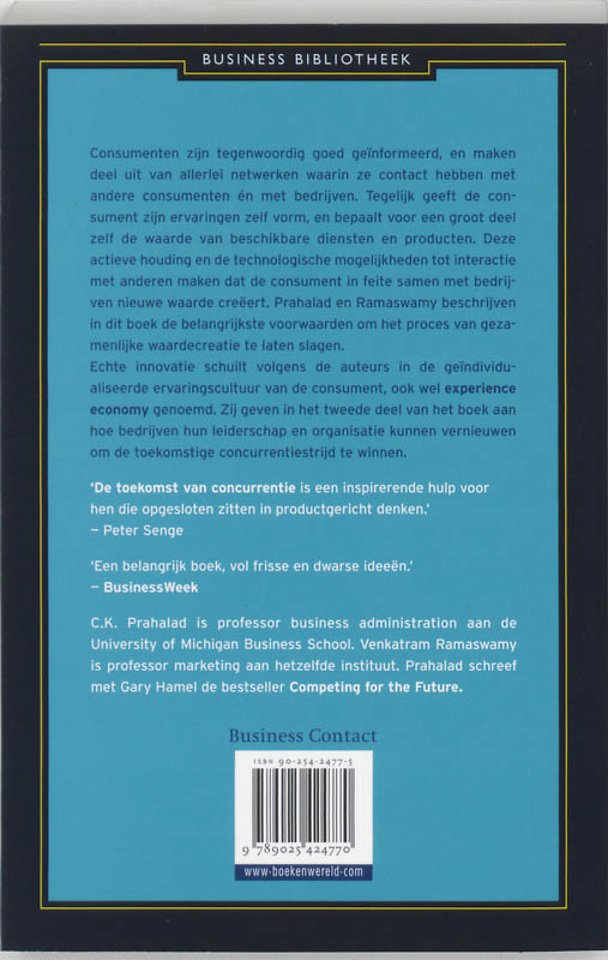 Meer over de auteursConsumenten zijn tegenwoordig goed geïnformeerd en maken deel uit van allerlei netwerken waarin ze contact hebben met andere consumenten en met bedrijven. Tegelijk geeft de consument zijn ervaringen zelf vorm en bepaalt voor een groot deel zelf de waarde van beschikbare diensten en producten. Deze actieve houding en de technologische mogelijkheden tot interactie met anderen maken dat de consument in feite samen met bedrijven nieuwe waarde creëert. Prahalad en Ramaswamy beschrijven in dit boek de belangrijkste voorwaarden om het proces van gezamenlijke waardecreatie te laten slagen.