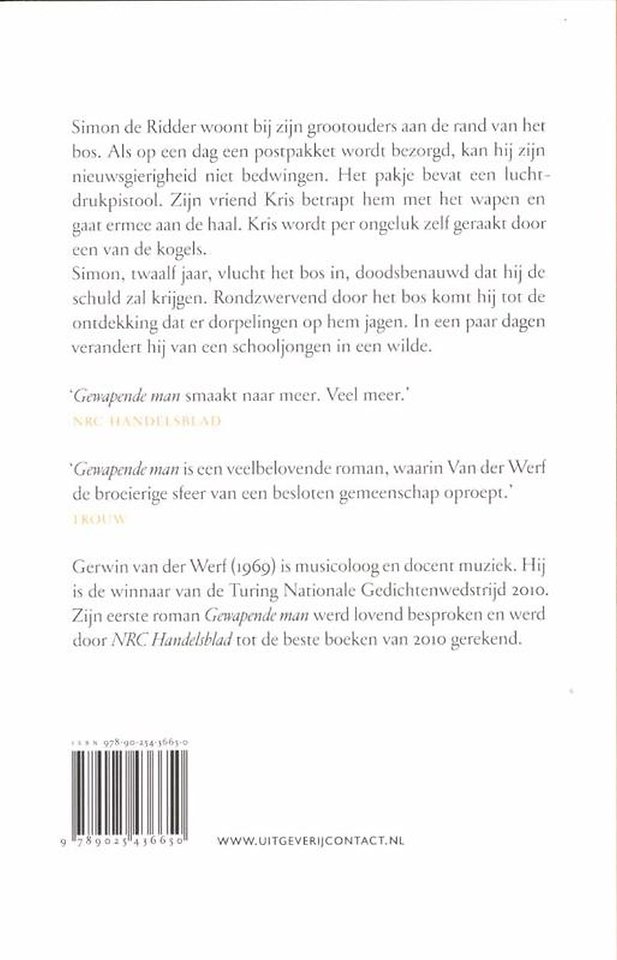 Gerwin van der Werf (1969) is schrijver, recensent en columnist. In 2010 won hij met zijn gedicht ‘Misbruik’ de Turing Gedichtenwedstrijd. Datzelfde jaar debuteerde hij met 'Gewapende man'. Zijn populaire columns over het schoolleven werden gebundeld in 'Schooldagen' (2014) en 'Stampen en zingen' (2018).