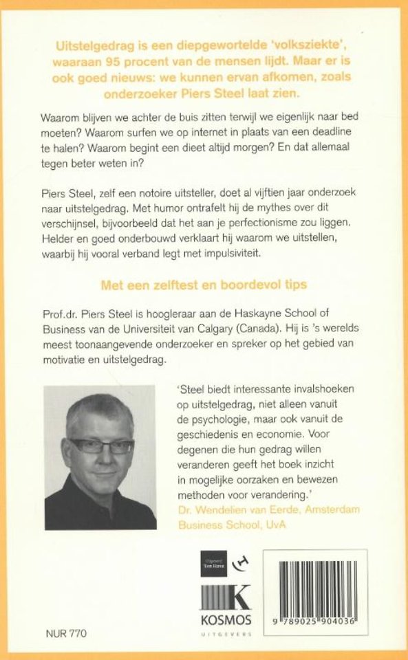 Professor Piers Steel, zelf een notoire uitsteller, doet al ruim tien jaar onderzoek naar uitstelgedrag. Met humor ontrafelt hij de mythes over dit verschijnsel, bijvoorbeeld dat het aan iemands perfectionisme zou liggen. Helder en onderbouwd verklaart hij ons uitstellen, waarbij hij vooral het verband legt met impulsiviteit.
