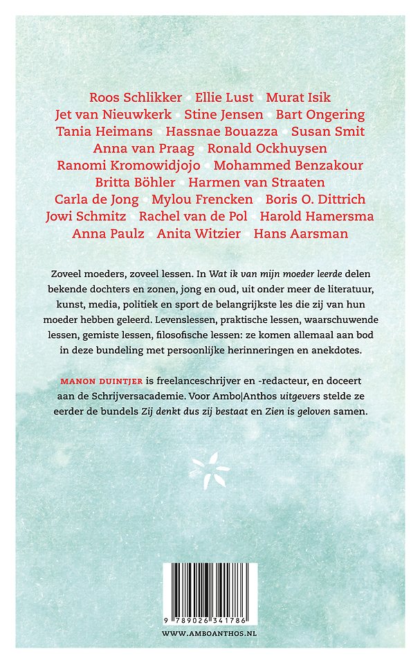 In Wat ik van mijn moeder leerde delen bekende dochters en zonen, jong en oud, uit onder meer de literatuur, kunst, media, politiek, wetenschap en sport de belangrijkste les die zij van hun moeder hebben geleerd.