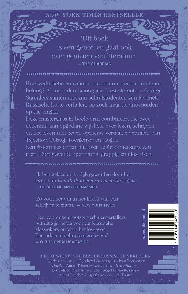 Hoe werkt fictie en waarom is het nu meer dan ooit van belang? Al meer dan twintig jaar leest sterauteur George Saunders samen met zijn schrijfstudenten zijn favoriete Russische korte verhalen, op zoek naar de antwoorden op die vragen.