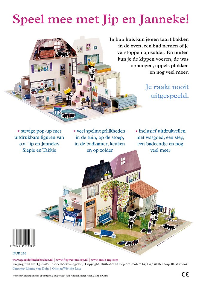 Speel mee met Jip en Janneke! In hun huis kun je een taart bakken in de oven, een bad nemen of je verstoppen op zolder. En buiten kun je de kippen voeren, de was ophangen, appels plukken en nog veel meer. Je raakt nooit uitgespeeld. Stevige pop-up met uitdrukbare figuren van o.a. Jip en Janneke, Siepie en Takkie veel spelmogelijkheden: in de tuin, op de stoep, in de badkamer, keuken en op zolder inclusief uitdrukvellen met wasgoed, een step, een badeendje en nog veel meer