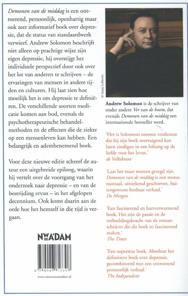 'Demonen van de middag' is een ontroerend, persoonlijk, openhartig maar ook zeer informatief boek over depressie, dat de status van standaardwerk verwierf en dat het dus alleszins verdient om weer leverbaar te zijn. Andrew Solomon beschrijft niet alleen op prachtige wijze zijn eigen depressie, hij overstijgt het individuele perspectief door ook over het lot van anderen te schrijven - de ervaringen van mensen in andere tijden en culturen.Solomon laat zien hoe moeilijk het is om depressie te definiëren. De verschillende soorten medicatie komen aan bod, evenals de therapeutische behandelmethoden en de effecten die de ziekte op een mensenleven kan hebben. Een belangrijk en adembenemend boek.