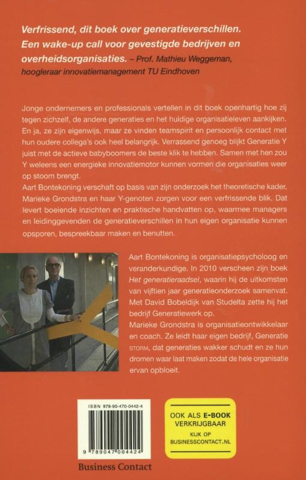 In dit boek is Generatie Y zelf aan het woord. Jonge ondernemers en professionals vertellen openhartig hoe zij tegen de andere generaties aankijken, wat hun op- en tegenvalt. En ja, ze zijn eigenwijs; maar ze vinden teamspirit en persoonlijk contact met oudere generaties ook belangrijk. Met een open mind spreken ze met hen over carrière, echt samenwerken en inspirerend leiderschap. Een van de opvallende conclusies is dat Generatie Y juist met de actieve babyboomers een goede klik heeft.