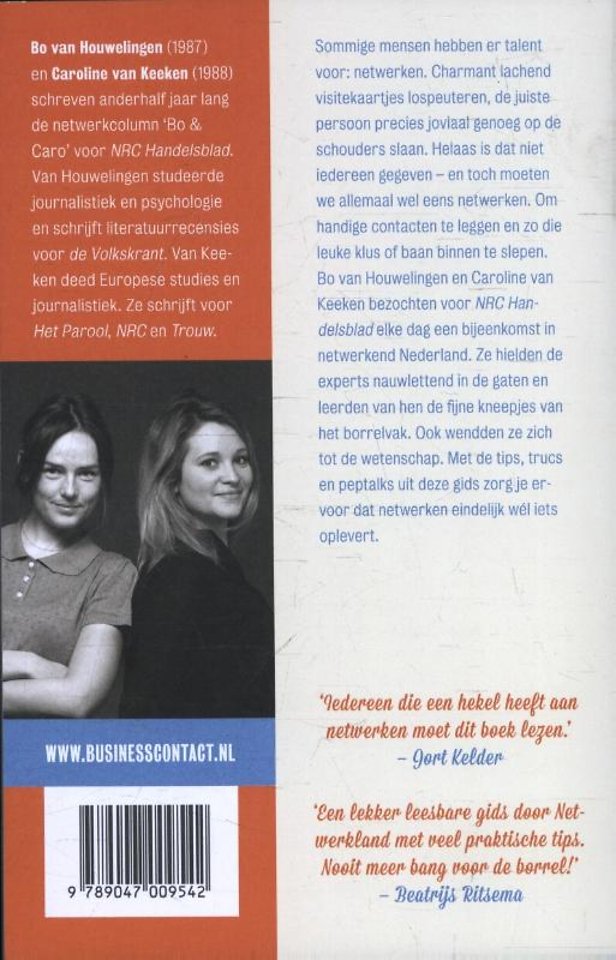 Bo van Houwelingen en Caroline van Keeken bezochten voor NRC Handelsblad elke dag een bijeenkomst in netwerkend Nederland. Ze hielden de experts nauwlettend in de gaten en leerden van hen de fijne kneepjes van het borrelvak. Ook wendden ze zich tot de wetenschap. Met de tips, trucs en peptalks uit deze gids zorg je ervoor dat netwerken eindelijk wél iets oplevert.