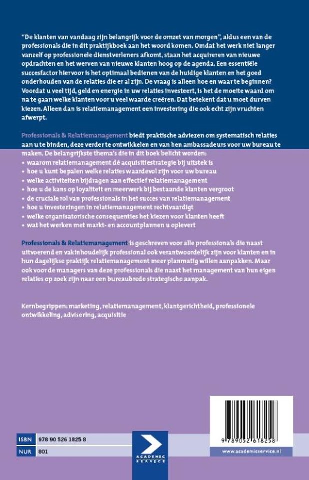 'Professionals & Relatiemanagement' is geschreven voor alle professionals die naast uitvoerend en vakinhoudelijk professional ook verantwoordelijk zijn voor klanten en in hun dagelijkse praktijk relatiemanagement meer planmatig willen aanpakken. Maar ook voor de managers van deze professionals die naast het management van hun eigen relaties op zoek zijn naar een bureaubrede strategische aanpak.