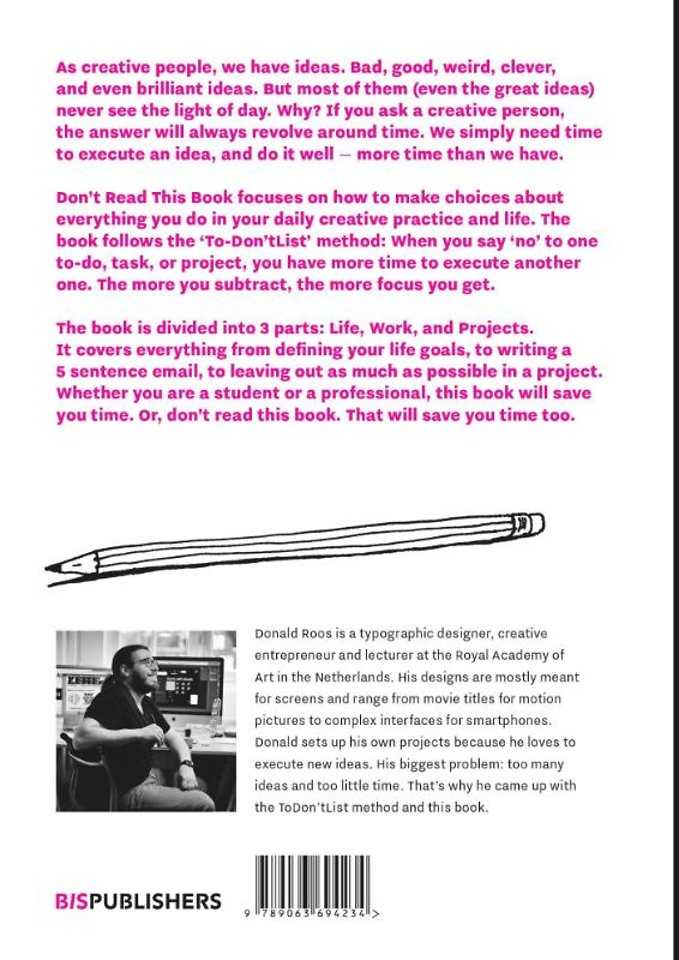 'Don’t Read This Book' focuses on how to make choices about everything you do in your daily creative practice and life. The book follows the ‘To Don’t List’ method: When you say ‘no’ to one idea, you have more time to execute another one. In short: the more you subtract, the more focus and time you get.