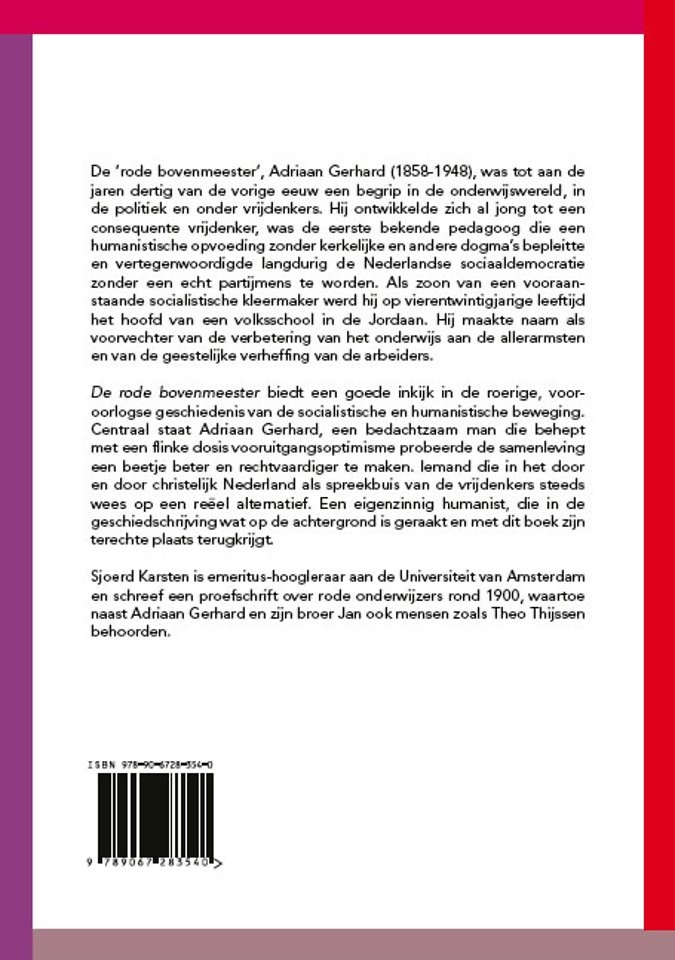 De ‘rode bovenmeester’, Adriaan Gerhard (1858-1948), was tot aan de jaren dertig van de vorige eeuw een begrip in de onderwijswereld, in de politiek en onder vrijdenkers. Hij ontwikkelde zich al jong tot een consequente vrijdenker, was de eerste bekende pedagoog die een humanistische opvoeding zonder kerkelijke en andere dogma’s bepleitte en vertegenwoordigde langdurig de Nederlandse sociaaldemocratie zonder een echt partijmens te worden. Als zoon van een vooraanstaande socialistische kleermaker werd hij op vierentwintigjarige leeftijd het hoofd van een volksschool in de Jordaan. Hij maakte naam als voorvechter van de verbetering van het onderwijs aan de allerarmsten en van de geestelijke verheffing van de arbeiders.