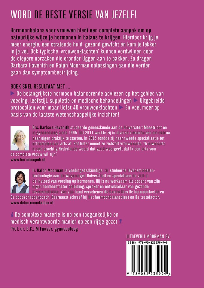 Hormoonbalans voor vrouwen biedt een complete aanpak om op natuurlijke wijze je hormonen in balans te krijgen. Hierdoor krijg je meer energie, een stralende huid, gezond gewicht én kom je lekker in je vel. Ook typische ‘vrouwenklachten’ kunnen verdwijnen door de diepere oorzaken die eronder liggen aan te pakken. Zo dragen Barbara Havenith en Ralph Moorman oplossingen aan die verder gaan dan symptoombestrijding.