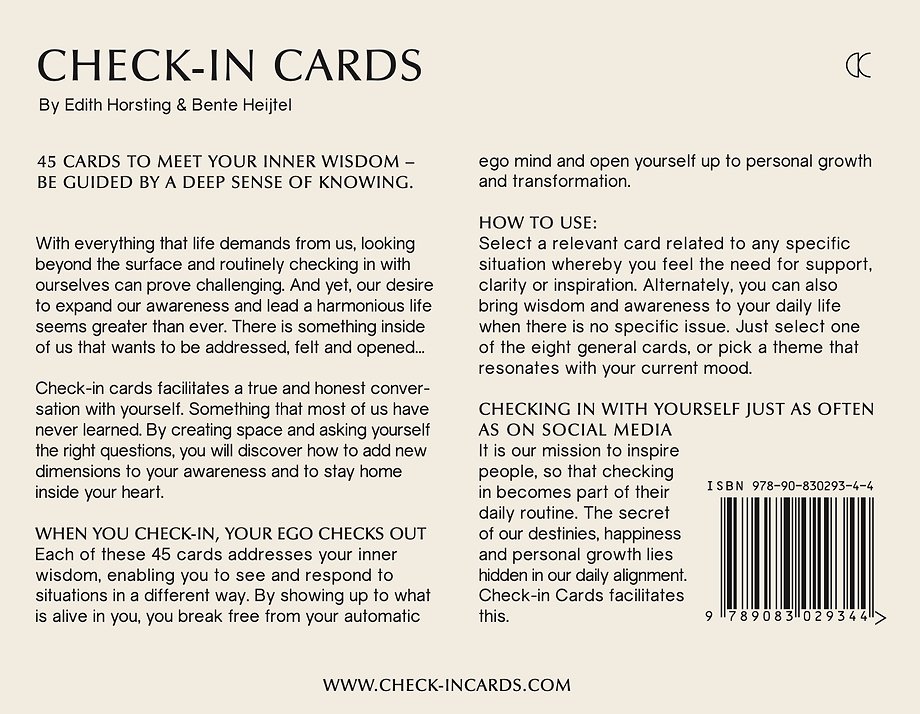 With everything that life demands from us, looking beyond the surface and routinely checking in with ourselves can prove challenging. And yet, our desire to expand our awareness and lead a harmonious life seems greater than ever. There is something inside of us that wants to be addressed, felt and opened... Check-in cards facilitates a true and honest conversation with yourself. Something that most of us have never learned. By creating space and asking yourself the right questions, you will discover how to add new dimensions to your awareness and to stay home inside your heart.