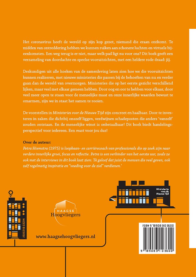 Deskundigen uit alle hoeken van de samenleving laten zien hoe we die vooruitzichten kunnen realiseren, met nieuwe ministeries die passen bij de behoeften van nu en verder gaan dan de wereld van overmorgen. Ministeries die op het eerste gezicht verschillend lijken, maar veel met elkaar gemeen hebben. Door oog en oor te hebben voor elkaar, door veel meer open te staan voor de menselijke maat en onze innerlijke waarden bewust te omarmen, zijn we in staat het samen te rooien.