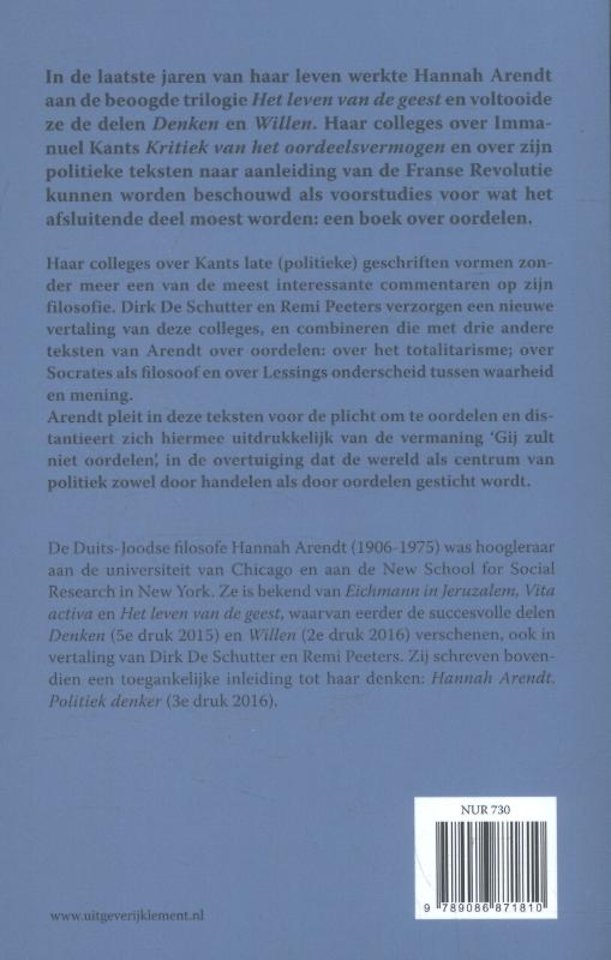 Dirk De Schutter en Remi Peeters verzorgen een nieuwe vertaling van deze colleges, en combineren die met drie andere teksten van Arendt over oordelen: over het totalitarisme; over Socrates als filosoof en over Lessings onderscheid tussen waarheid en mening.