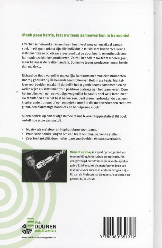 Richard de Hoop vergelijkt menselijke karakters met muziekinstrumenten. Daarbij gebruikt hij de bekende teamrollen van Belbin als basis. Met talloze voorbeelden maakt hij duidelijk hoe u goede teams samenstelt en op welke wijze elk instrument zijn positieve bijdrage aan het team levert. Door het invullen van een eenvoudige vragenlijst bepaalt u snel welk instrument uw teamleden en u het best beheersen. Bent u een hardwerkende bas, een inspirerende trompet of een energieke trom? Is die medewerker een creatieve gitaar, een planmatige hoorn of een behulpzame viool?