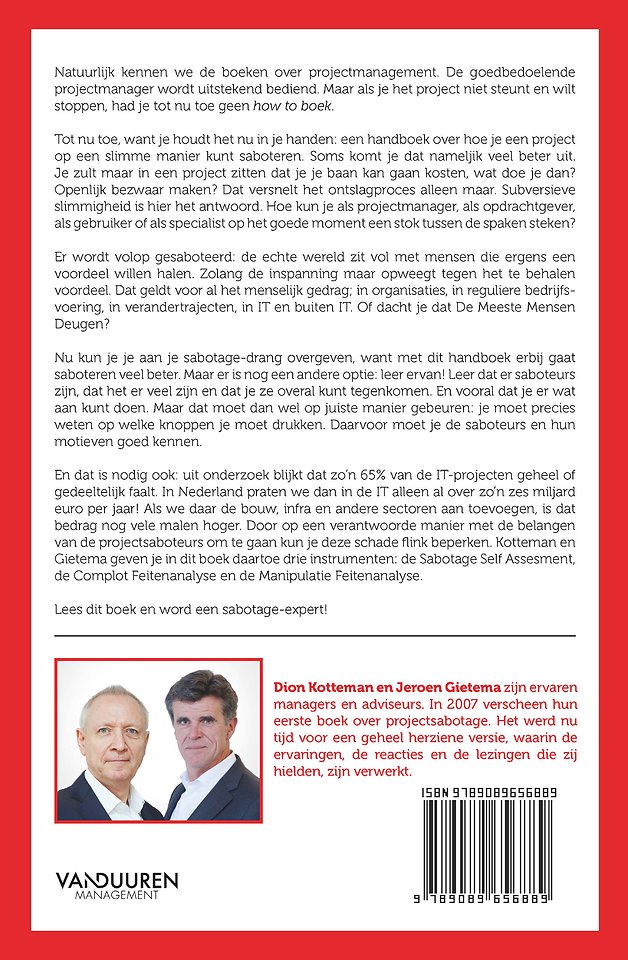 En dat is nodig ook: uit onderzoek blijkt dat zo’n 65% van de IT-projecten geheel of gedeeltelijk faalt. In Nederland praten we dan in de IT alleen al over zo’n zes miljard euro per jaar! Als we daar de bouw, infra en andere sectoren aan toevoegen, is dat bedrag nog vele malen hoger. Door op een verantwoorde manier met de belangen van de projectsaboteurs om te gaan kun je deze schade flink beperken. Kotteman en Gietema geven je in dit boek daartoe drie instrumenten: de Sabotage Self Assesment, de Complot Feitenanalyse en de Manipulatie Feitenanalyse.