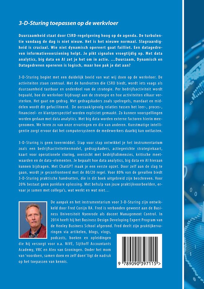 3-D-Sturing is geen tovermiddel. Stap voor stap ontwikkel je het instrumentarium zoals een bedrijfsactiviteitenmodel, gedragskaders, actiegerichte strategiekaart, kaart voor operationele sturing, overzicht met bedrijfsdimensies, kritische meetwaarden en de data-elementen. Je bepaalt hoe data analytics, big data en AI hieraan kunnen bijdragen. Met ChatGPT maak je een eerste opzet. Door zelf aan de slag te gaan, wordt je geconfronteerd met de 80/20 regel. Voor 80% van de gevallen biedt 3-D-Sturing praktische handvatten, die in dit boek uitgebreid zijn beschreven. Voor 20% bestaat geen panklare oplossing. Met behulp van jouw praktijkvoorbeelden, ervaar je samen met collega’s, wat werkt en wat niet…