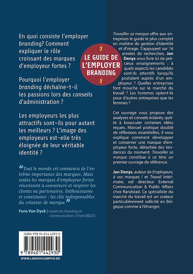 En quoi consiste l'employer branding? Comment expliquer le rôle croissant des marques d'employeur fortes ?Pourquoi l'employer branding déchaîne-t-il les passions lors des conseils d'administration ?Les employeurs les plus attractifs sont-ils pour autant les meilleurs ? L'image des employeurs est-elle très éloignée de leur véritable identité ?Travailler sa marque offre aux entreprises le guide le plus complet en matière de gestion d'identité et d'image. S'appuyant sur 16 années de recherches, Jan Denys vous livre ici de précieux enseignements : à quels aspects les candidats sont-ils attentifs lorsqu'ils postulent auprès d'un employeur ? Quelles entreprises font mouche sur le marché du travail ? Les hommes optent-ils pour d'autres entreprises que les femmes ?