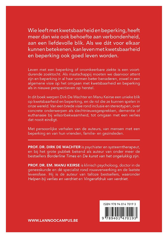 In dit boek kijken beide auteurs precies naar het leven met kwetsbaarheid en beperking. Dagelijks geconfronteerd worden met de grenzen van wat kan en wat niet (meer) mogelijk is, is erg confronterend voor alle betrokkenen. Door beter te luisteren naar mensen met een beperking zelf, hun familieleden en hulpverleners komen ze tot een nieuwe kijk op beperking.