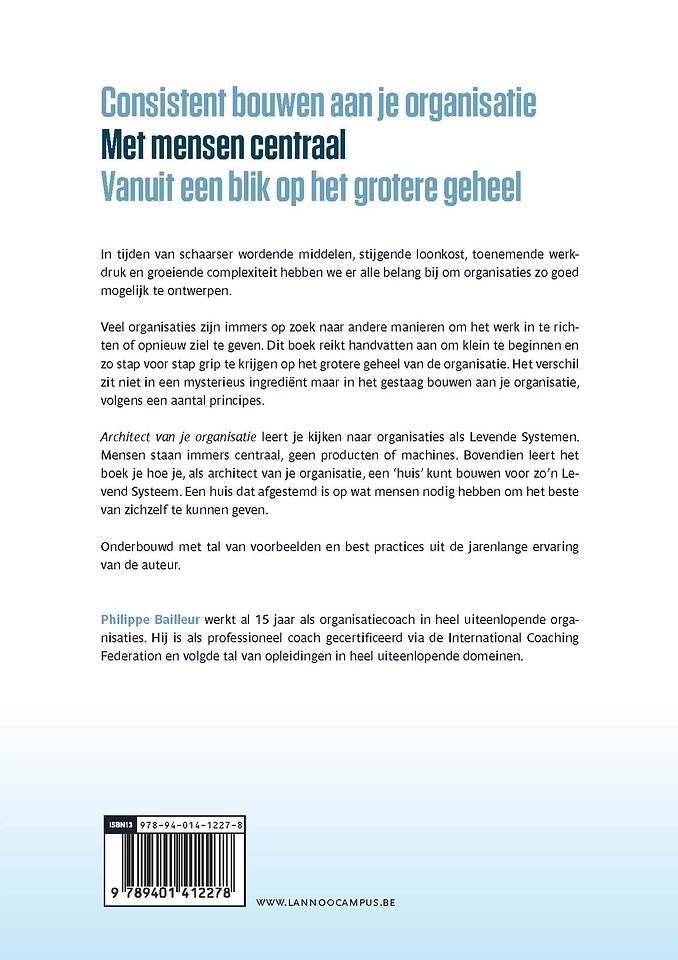 Architect van je organisatie leert je kijken naar organisaties als Levende Systemen. Mensen staan immers centraal, geen producten of machines. Bovendien leert het boek je hoe je, als architect van je organisatie, een 'huis' kunt bouwen voor zo'n Levend Systeem. Een huis dat afgestemd is op wat mensen nodig hebben om het beste van zichzelf te kunnen geven.
