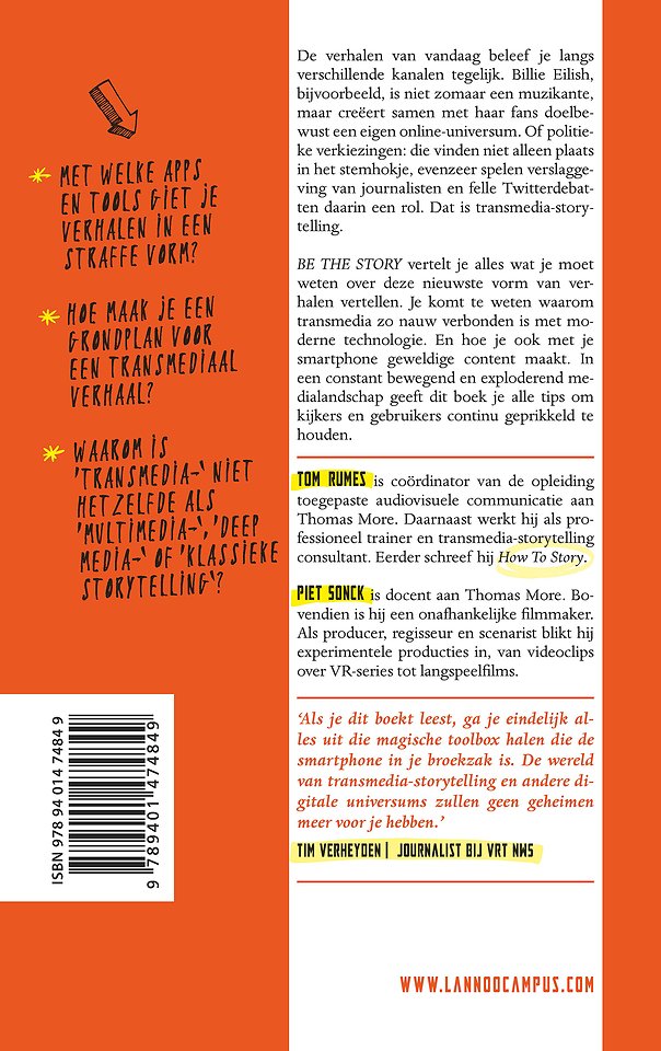 BE THE STORY vertelt je alles wat je moet weten over deze nieuwste vorm van verhalen vertellen. Je komt te weten waarom transmedia zo nauw verbonden is met moderne technologie. En hoe je ook met je smartphone geweldige content maakt. In een constant bewegend en exploderend medialandschap geeft dit boek je alle tips om kijkers en gebruikers continu geprikkeld te houden.