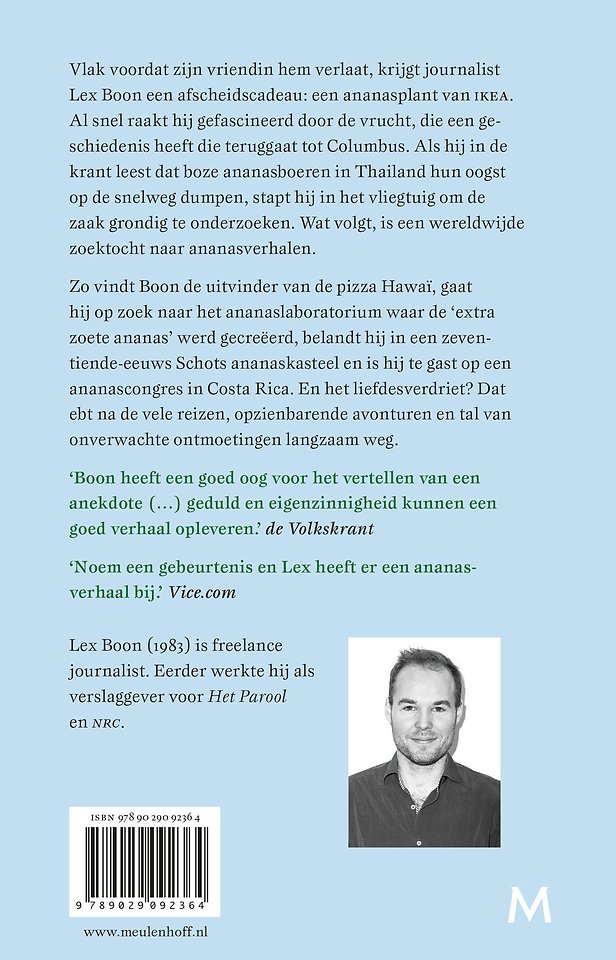 Zo vindt Boon de uitvinder van de pizza Hawaï, gaat hij op zoek naar het ananaslaboratorium waar de ‘extra zoete ananas’ werd gecreëerd, belandt hij in een achttiende-eeuws Schots ananaskasteel en is hij te gast op een ananascongres in Costa Rica. En het liefdesverdriet? Dat ebt na de vele reizen, opzienbarende avonturen en tal van onverwachte ontmoetingen langzaam weg.
