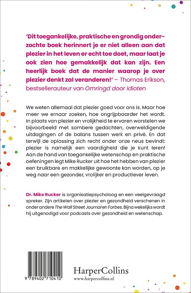 Mike Rucker laat zien dat plezier een vaardigheid is die je kunt leren. Het is een actie die je kunt ondernemen, altijd en overal. Aan de hand van toegankelijke wetenschap en praktische oefeningen legt hij uit hoe het hebben van plezier een bruikbare en makkelijke gewoonte kan worden.