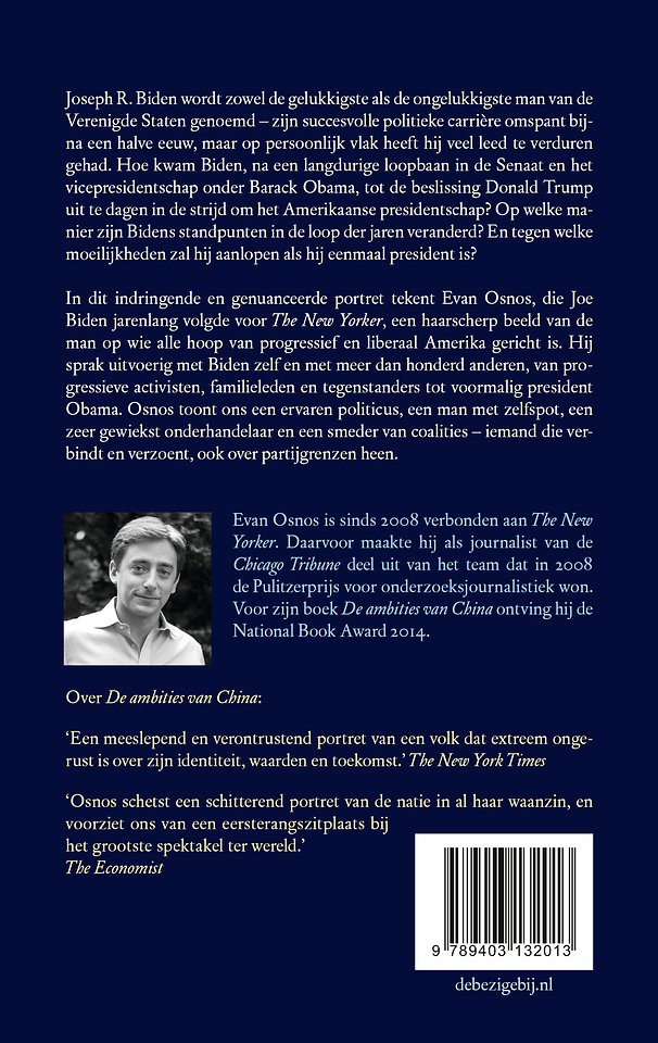 In dit indringende en genuanceerde portret schetst Evan Osnos, die Joe Biden jarenlang volgde voor The New Yorker, een haarscherp beeld van de man op wie alle hoop van progressief en liberaal Amerika gericht is. Hij sprak uitvoerig met Biden zelf en met meer dan honderd anderen, van progressieve activisten, tegenstanders en familieleden tot voormalig president Obama. Osnos toont ons een ervaren politicus, een man met zelfspot, een zeer gewiekst onderhandelaar en een smeder van coalities – iemand die verbindt en verzoent, ook over partijgrenzen heen.