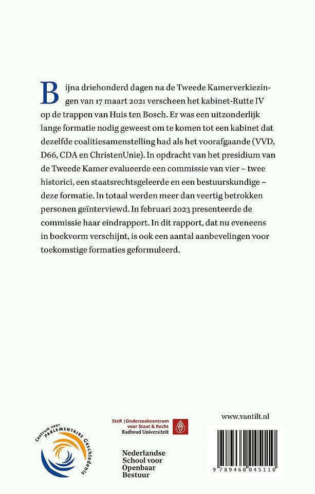 In opdracht van het presidium van de Tweede Kamer evalueerde een commissie van vier – twee historici, een staatsrechtsgeleerde en een bestuurskundige – deze formatie. In totaal werden meer dan veertig betrokken personen geïnterviewd. In februari 2023 presenteerde de commissie haar eindrapport. In dit rapport, dat nu eveneens in boekvorm verschijnt, is ook een aantal aanbevelingen voor toekomstige formaties geformuleerd.