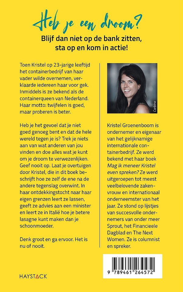 Heb je het gevoel dat je niet goed genoeg bent en dat de hele wereld tegen je is? Trek je niets aan van wat anderen van jou vinden en doe alles wat je kunt om je droom te verwezenlijken. Geef nooit op. Laat je overtuigen door Kristel, die in dit boek beschrijft hoe ze zelf de ene na de andere tegenslag overwint. In haar ontdekkingstocht naar haar eigen grenzen leert ze lassen, geeft ze advies aan een minister en leert ze in Italië hoe je betere lasagne kunt maken dan je schoonmoeder.