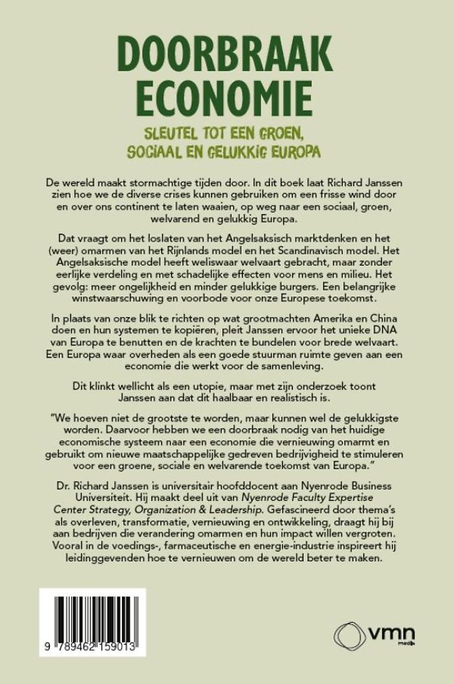 In plaats van onze blik te richten op wat grootmachten Amerika en China doen en hun systemen te kopiëren, pleit Janssen ervoor het unieke DNA van Europa te benutten en de krachten te bundelen voor brede welvaart. Een Europa waar overheden als een goede stuurman ruimte geven aan een economie die werkt voor de samenleving.