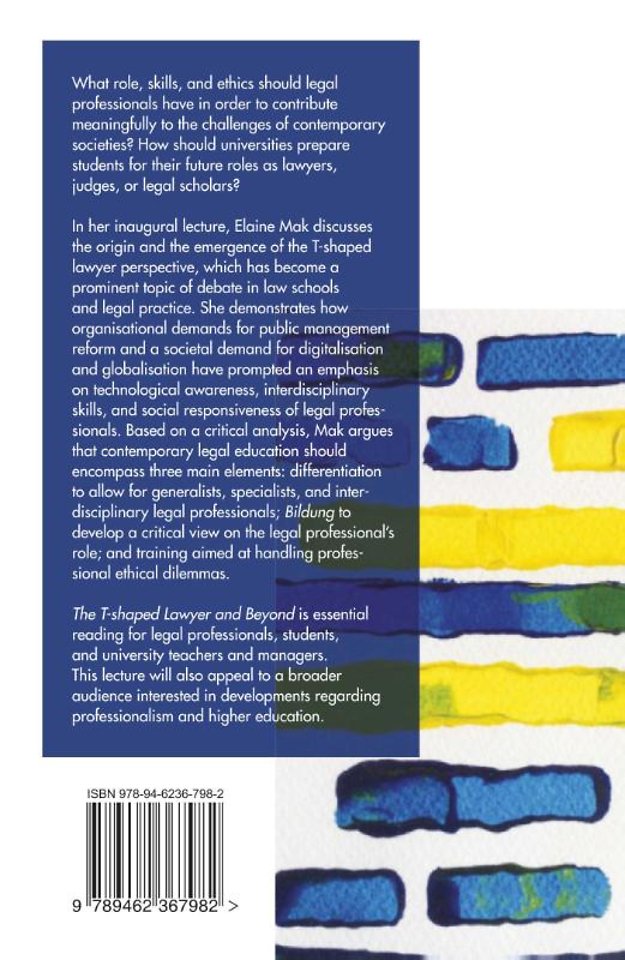 In this inaugural lecture, Elaine Mak traces the emergence of the image of the T-shaped lawyer, which has become prominent in current debates in law schools and legal practice. She demonstrates how organisational demands – relating to new public management – and societal demands – relating to digitalisation and globalisation – have prompted the emphasis on technological awareness, interdisciplinary skills, and social responsiveness of legal professionals.