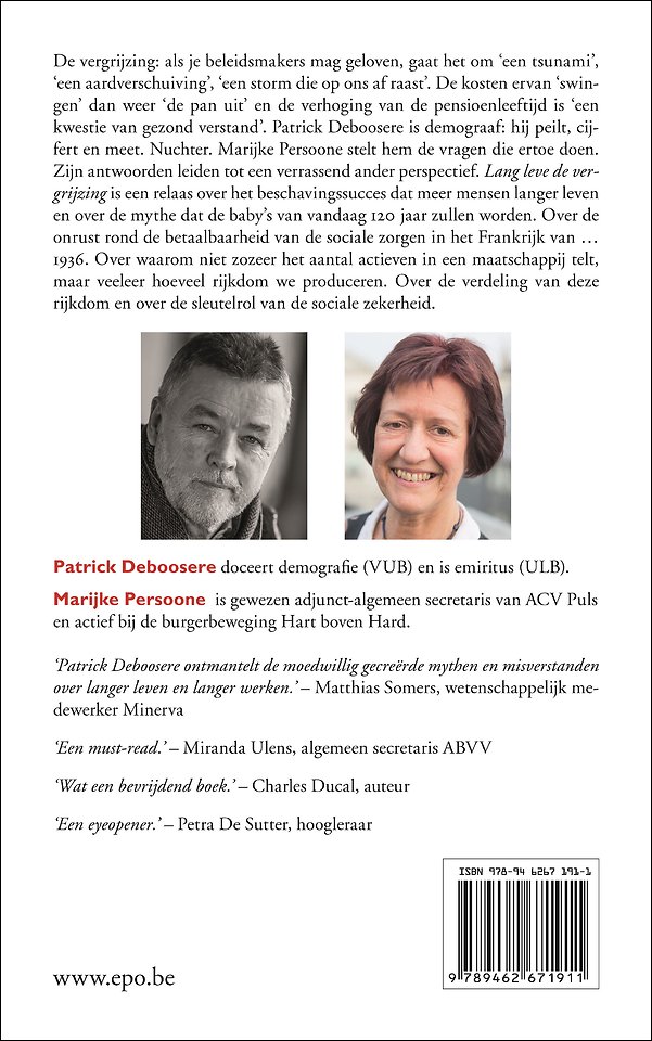 Nuchter. Marijke Persoone stelt hem de vragen die ertoe doen. Zijn antwoorden leiden tot een verrassend ander perspectief. Lang leve de vergrijzing is een relaas over het beschavingssucces dat meer mensen langer leven en over de mythe dat de baby's van vandaag 120 jaar zullen worden.