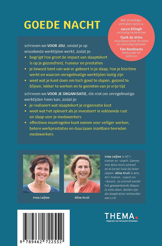 Irma Leijten en Aline Kruit schreven daarom het eerste Nederlandstalige boek over onregelmatig werken en de invloed daarvan op slapen. Met behulp van de nieuwste wetenschappelijke inzichten en uiteenlopende ervaringsverhalen, geven zij adviezen over hoe je gezond onregelmatig kunt werken. Hoe kun je, met behoud van de voordelen, de nadelen zo klein mogelijk maken?