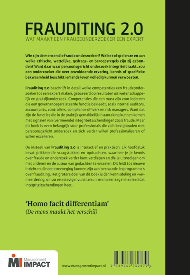 Frauditing 2.0 beschrijft in detail welke competenties een fraudeonderzoeker tot een expert maken, gebaseerd op resultaten uit wetenschappelijk en praktijkonderzoek. Competenties die een must zijn voor iedereen die een governancegerelateerde functie bekleedt, zoals internal auditors, accountants, controllers, compliance officers en risk managers. Want dat zijn de functies die in de praktijk gemakkelijk in aanraking kunnen komen met signalen van (vermeende) integriteitsschendingen zoals fraude. Maar dit boek is even belangrijk voor professionals die zich bezighouden met persoonsgericht onderzoek en zich verder willen professionaliseren of willen excelleren.