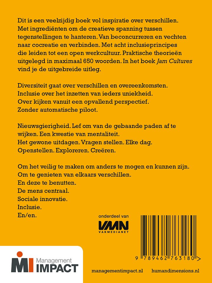 Meer over Jitske KramerDit is een veelzijdig boek vol inspiratie over verschillen. Met ingrediënten om de creatieve spanning tussen tegenstellingen te hanteren. Van beconcurreren en vechten naar cocreatie en verbinden. Met acht inclusieprincipes die leiden tot een open werkcultuur. Praktische theorieën uitgelegd in maximaal 650 woorden. In het boek 'Jam Cultures' vind je de uitgebreide uitleg.
