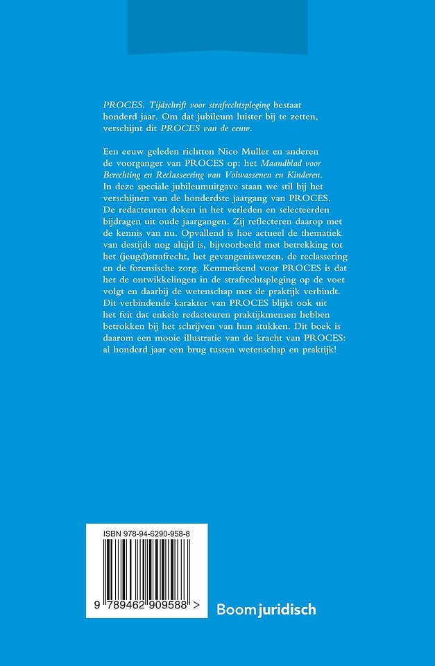 Een eeuw geleden richtten Nico Muller en anderen de voorganger van PROCES op: het Maandblad voor Berechting en Reclasseering van Volwassenen en Kinderen. In deze speciale jubileumuitgave staan we stil bij het verschijnen van de honderdste jaargang van PROCES. De redacteuren doken in het verleden en selecteerden bijdragen uit oude jaargangen. Zij reflecteren daarop met de kennis van nu. Opvallend is hoe actueel de thematiek van destijds nog altijd is, bijvoorbeeld met betrekking tot het (jeugd)strafrecht, het gevangeniswezen, de reclassering en de forensische zorg. Kenmerkend voor PROCES is dat het de ontwikkelingen in de strafrechtspleging op de voet volgt en daarbij de wetenschap met de praktijk verbindt. Dit verbindende karakter van PROCES blijkt ook uit het feit dat enkele redacteuren praktijkmensen hebben betrokken bij het schrijven van hun stukken. Dit boek is daarom een mooie illustratie van de kracht van PROCES: al honderd jaar een brug tussen wetenschap en praktijk!