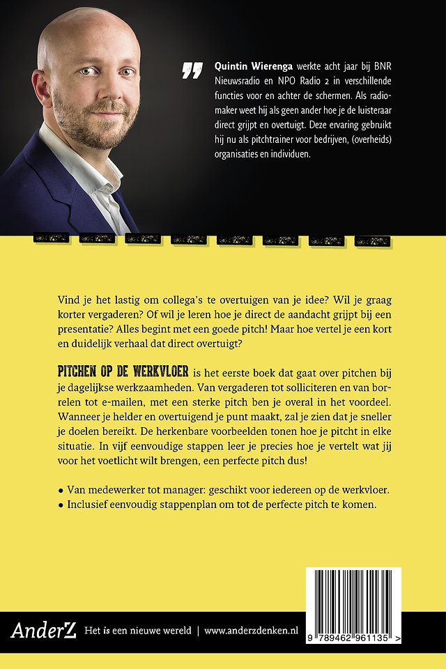 'Pitchen op de werkvloer' is het eerste boek dat gaat over pitchen bij je dagelijkse werkzaamheden. Wanneer je helder en overtuigend je punt maakt, zal je zien dat je sneller je doelen bereikt. De herkenbare voorbeelden tonen hoe je pitchen in kunt zetten. In vijf eenvoudige stappen leer je precies hoe je vertelt wat jij voor het voetlicht wilt brengen, een perfecte pitch dus!