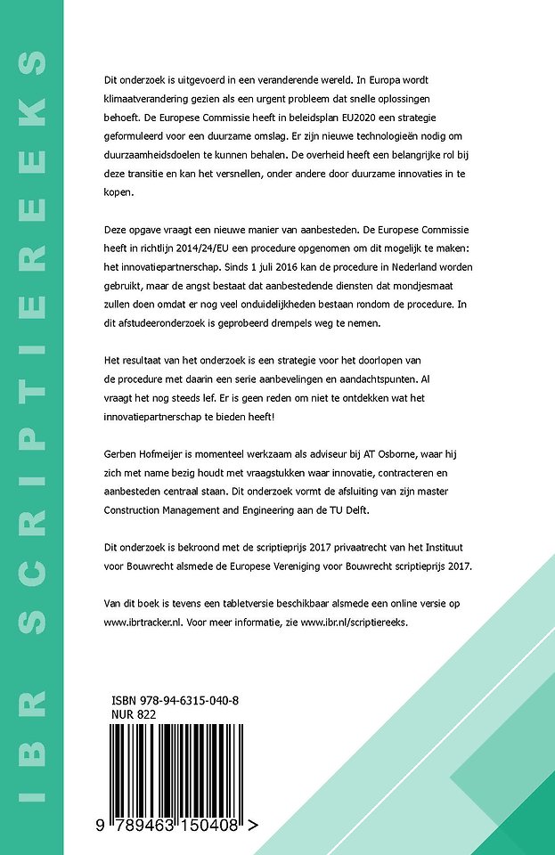 Deze opgave vraagt een nieuwe manier van aanbesteden. De Europese Commissie heeft in richtlijn 2014/24/EU een procedure opgenomen om dit mogelijk te maken: het innovatiepartnerschap. Sinds 1 juli 2016 kan de procedure in Nederland worden gebruikt, maar de angst bestaat dat aanbestedende diensten dat mondjesmaat zullen doen omdat er nog veel onduidelijkheden bestaan rondom de procedure. In dit afstudeeronderzoek is geprobeerd drempels weg te nemen.