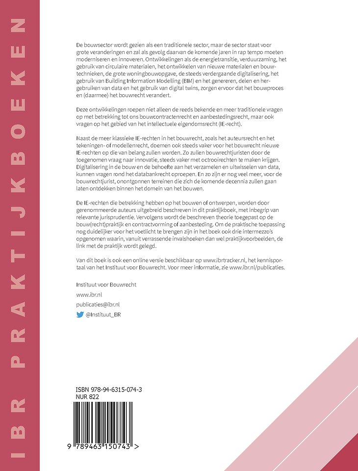 bouwrecht intellectuele eigendomsrechten auteursrecht architectenrecht tekeningen- en modellenrecht octrooirecht juridische aspecten wetgeving aanbestedingsrecht databankenrecht contractvorming bouwcontracten digitalisering innovatie bim dnr 2011 duurzaamheid exploitatierechten handhaving jurisprudentie persoonlijkheidsrechten praktijkboek beschermingsomvang