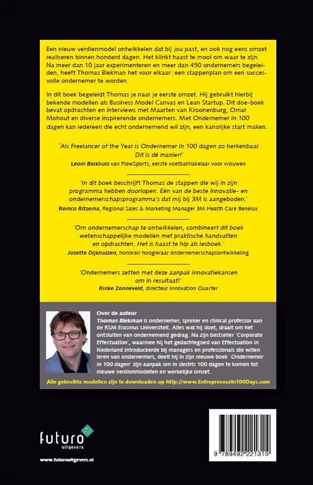 Meer over Thomas BlekmanEen nieuw verdienmodel ontwikkelen dat bij jou past, en ook nog eens omzet realiseren binnen 100 dagen. Het klinkt haast te mooi om waar te zijn. Na meer dan 10 jaar experimenteren en meer dan 450 ondernemers begeleiden, heeft Thomas Blekman het voor elkaar: een stappenplan om een succesvolle ondernemer te worden.