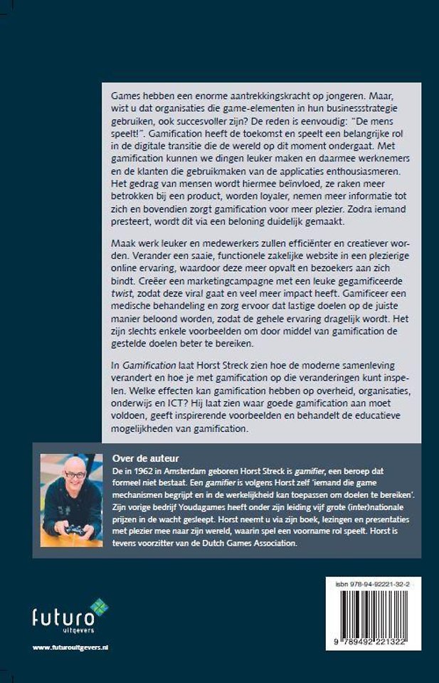In Gamification laat Horst Streck zien hoe de moderne samenleving verandert en hoe je met gamification op die veranderingen kunt inspelen. Welke effecten kan gamification hebben op overheid, organisaties, onderwijs en ICT? Hij laat zien waar goede gamification aan moet voldoen, geeft inspirerende voorbeelden en behandelt de educatieve mogelijkheden van gamification.